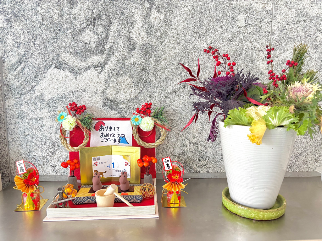 また、秋から社員が育ててくれていたお正月の寄せ植えも新年を彩る華やかな飾りとなっています😌